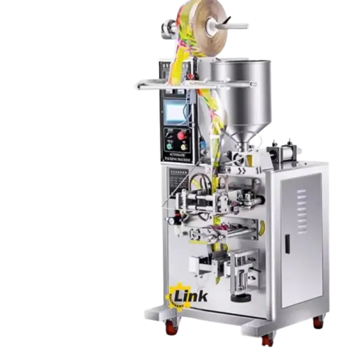 This is a vertical liquid/paste filling and four-side sachet sealing machine for packaging products such as yogurt, beverages, honey, ketchup, milk, condensed milk, shampoo, gel, lotion, liquid detergent, oil, cream, glue and similar liquids/pastes.