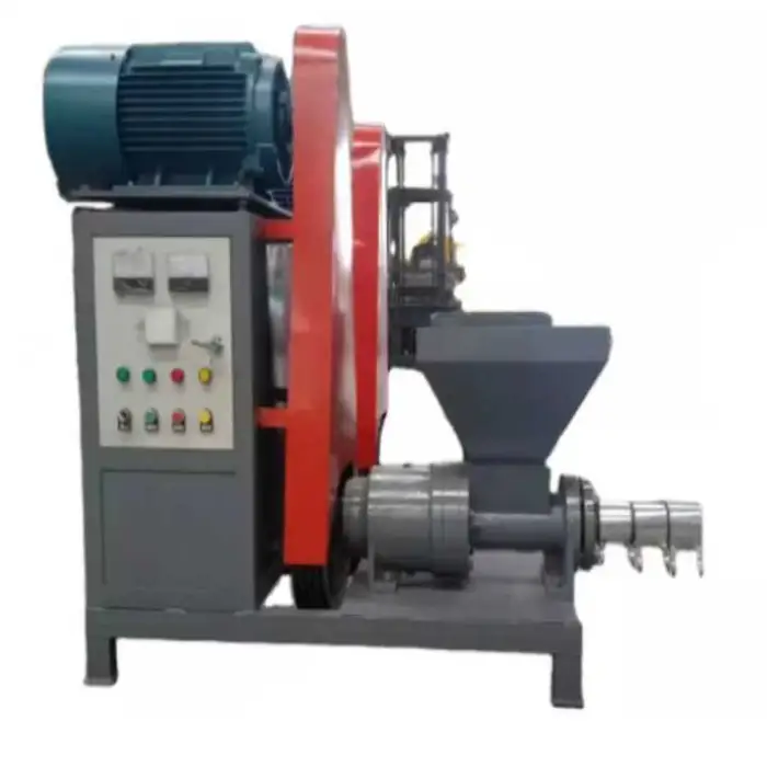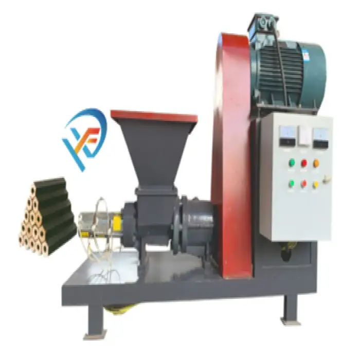 The machine features an efficient heating ring that enhances the quality of the briquettes, resulting in high-quality biomass charcoal briquettes.