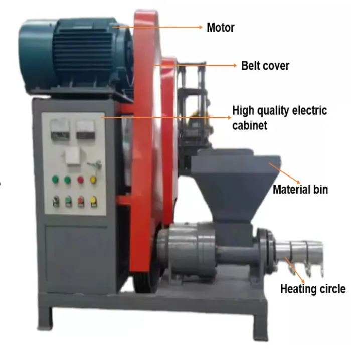 Key components include the motor, screw propeller, heating ring, and forming mold.