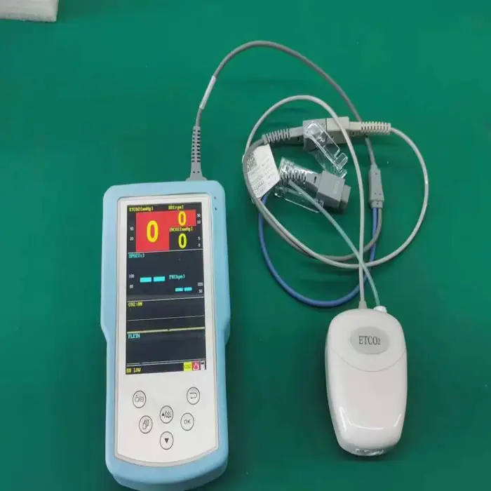 The ETCO2 range is from 0 to 150 mmHg, and the SpO2 range is from 0 to 100%, allowing for comprehensive respiratory monitoring.