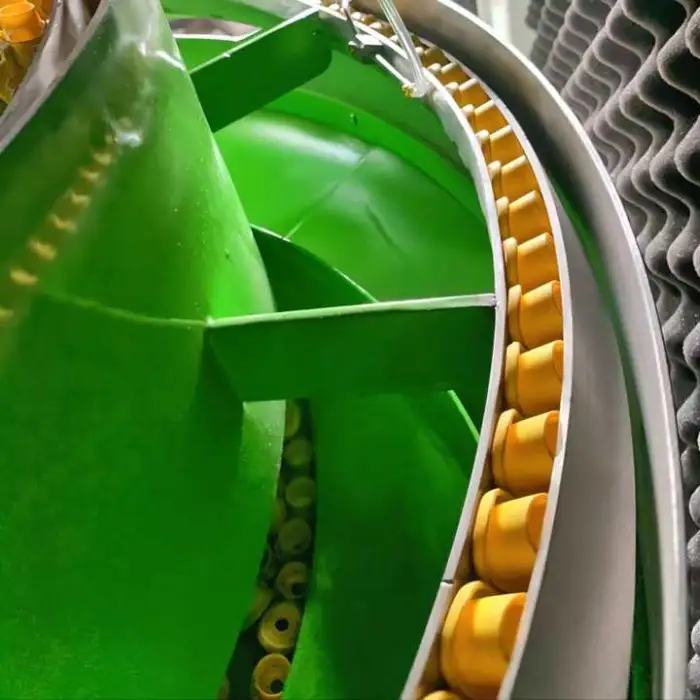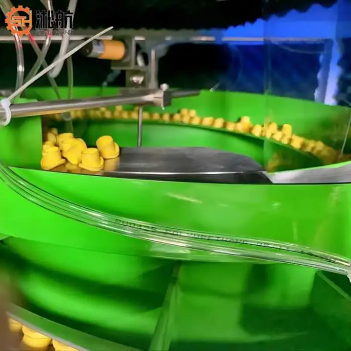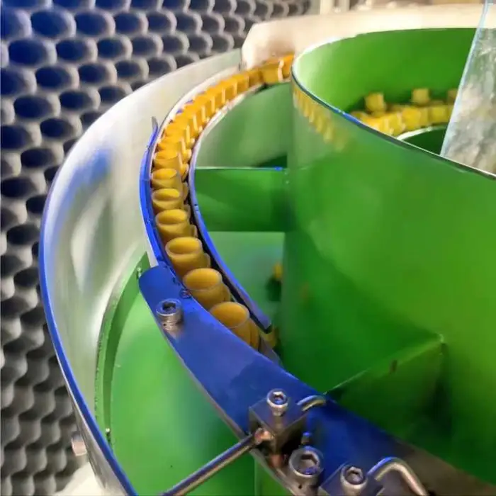 The vibrating bowl feeder uses vibrations to guide the caps into the correct position for packaging, ensuring efficient feeding.