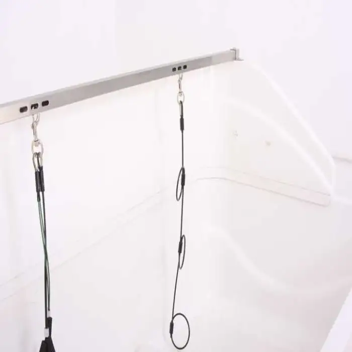 The bathing tub comes with an accessory kit and an overhead dog holding arm for safety during bathing.