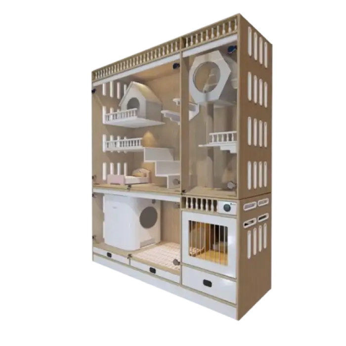 The luxury wooden cat hotel cage is available in a selection of colors, including natural wood finish, white, and dark brown. Check the product listing for current availability.