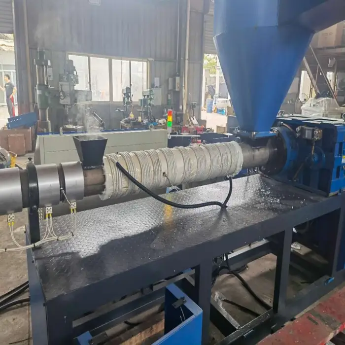 This machine can process PET bottles and PE woven bags as well as other types of waste plastics.