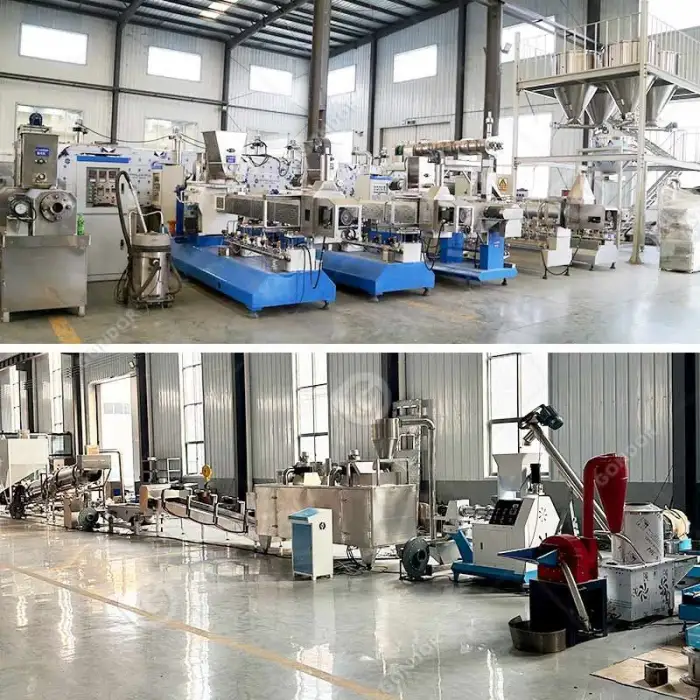 This machine uses a twin screw extruder, which is known for its durability and efficiency in producing high-quality feed.