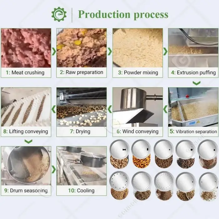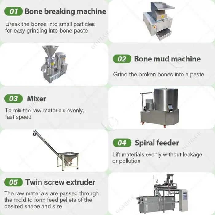 The machine can process various raw materials, including grain powder, meat, and bone, allowing for versatile production.
