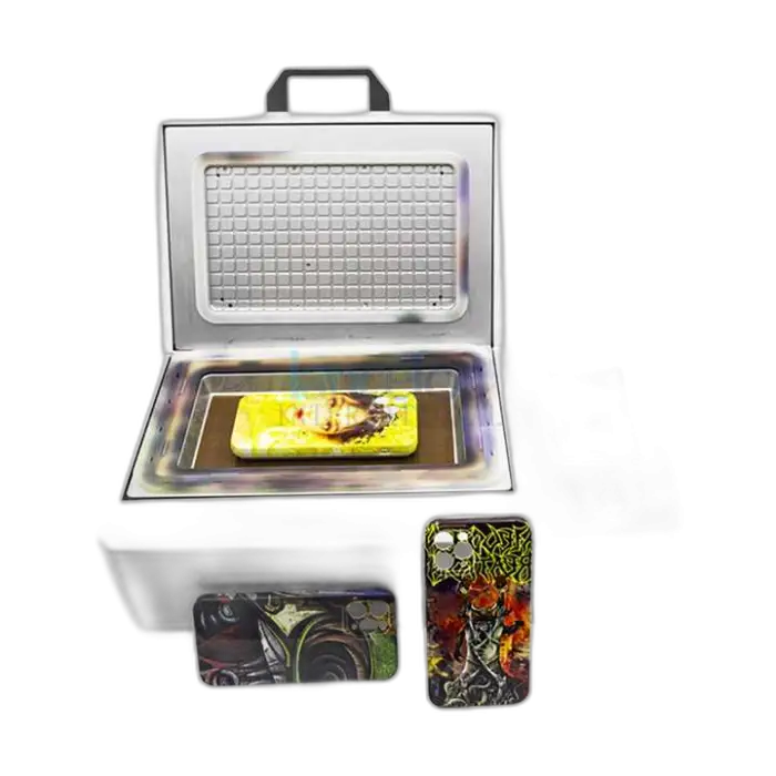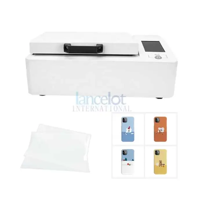 This is a Phone Case Making Machine with a heat transfer film print system and 3D vacuum heat press capability. It prints full-color designs using heat transfer ink (CMYK) and transfers those designs onto phone cases and other compatible substrates using heat and vacuum to conform to curved surfaces.