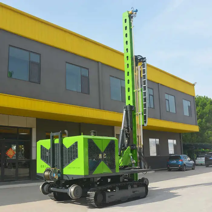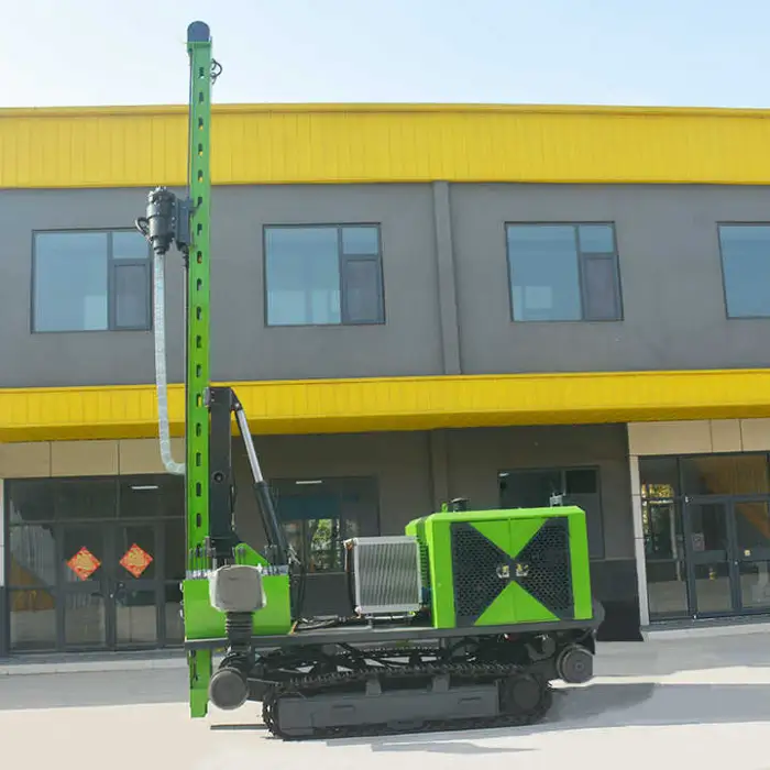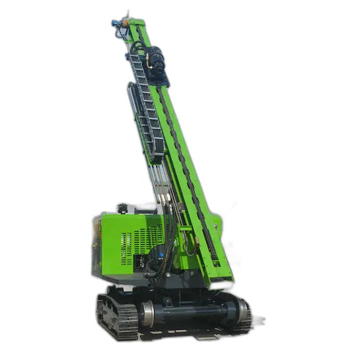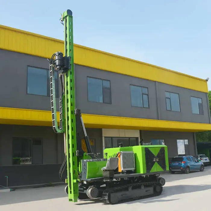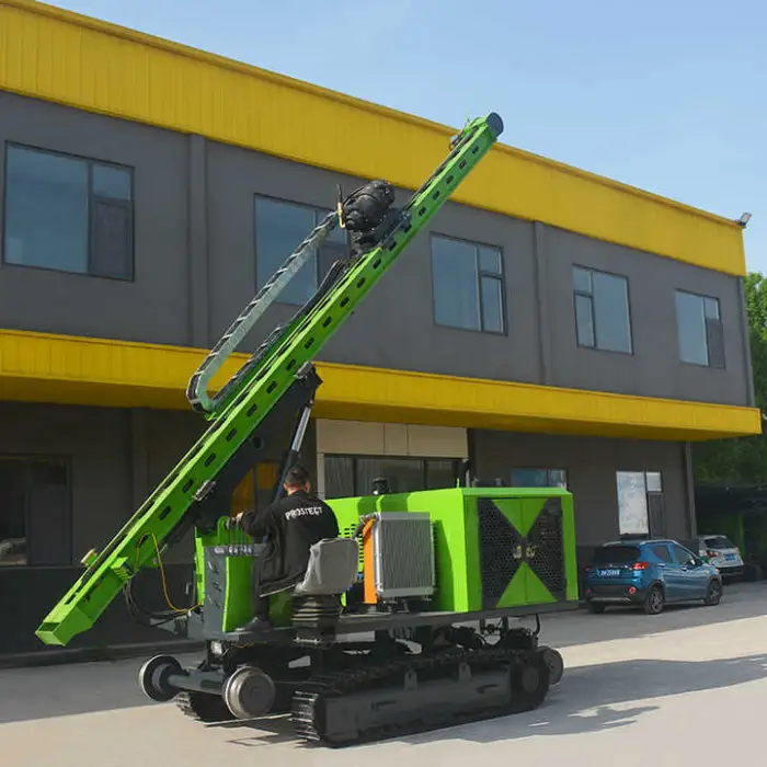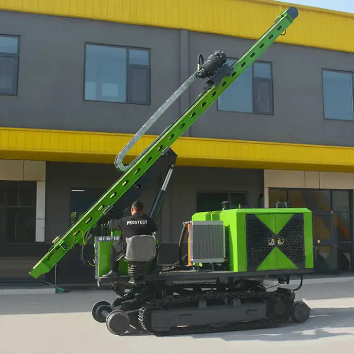 A compact, fully hydraulic pile driving and drilling rig designed primarily for installing spiral/screw piles used in ground-mounted photovoltaic (PV) systems. It is a mini mobile unit optimized for fast, efficient solar mounting and general piling tasks.