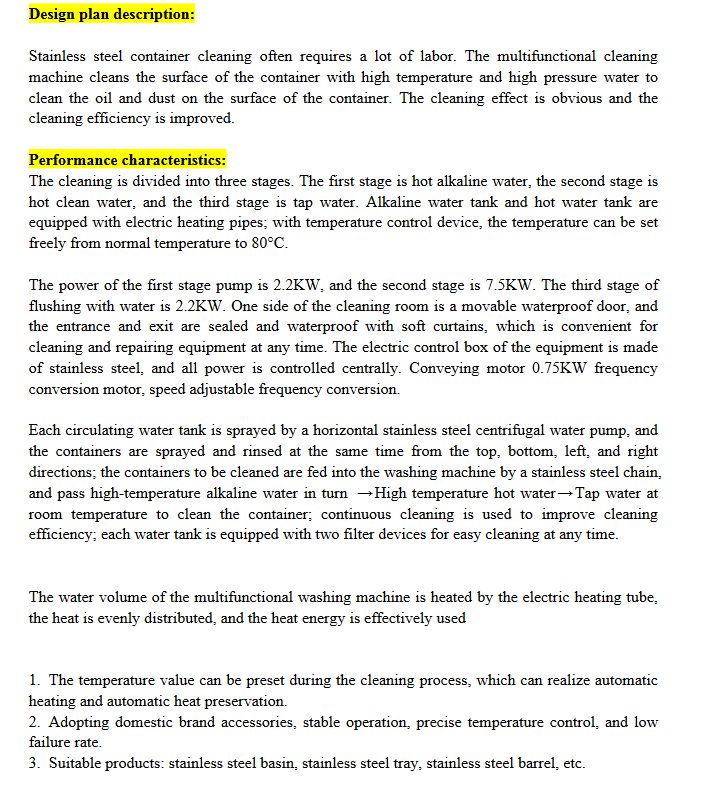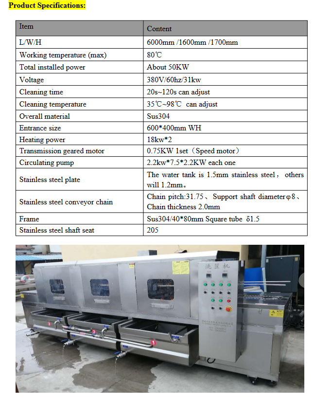 The overall dimensions of the Plastic Basket Washer Machine (6m) are designed to fit into standard industrial spaces, measuring approximately 6 meters in length and varying in width and height.