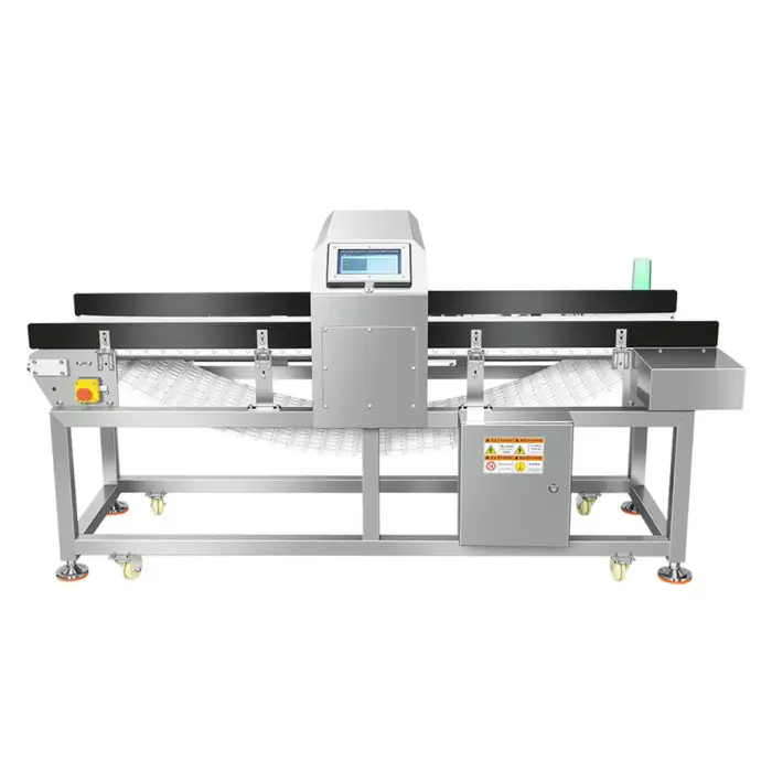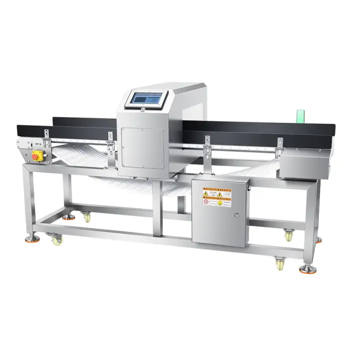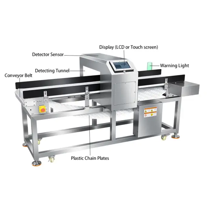The metal detector is constructed with a plastic belt, ensuring durability while being suitable for food processing.
