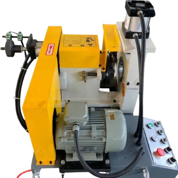 The machine operates using compressed air to perform chamfering automatically, ensuring smooth and accurate results.