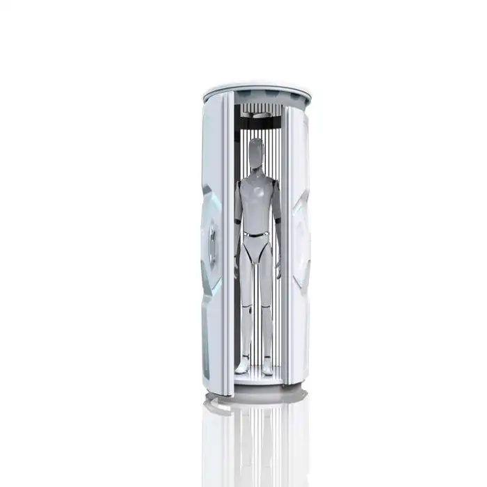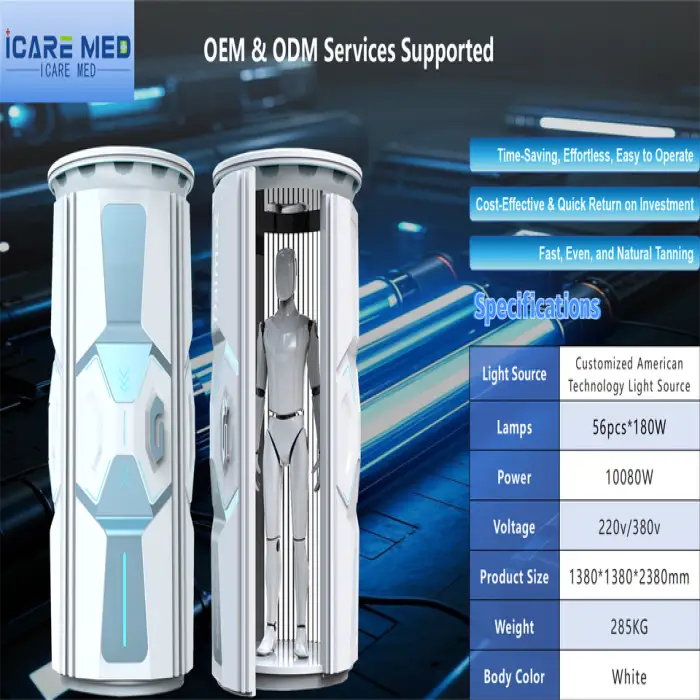 The unit uses 56 high-wattage lamps (180W each) designed for broad and even body coverage, producing fast and consistent tanning across the target areas.
