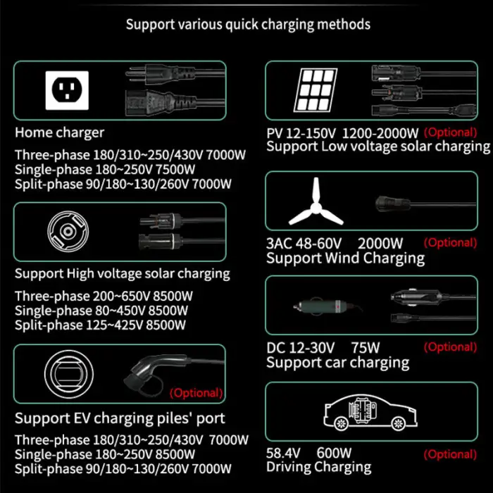 You can charge the power station using low-voltage solar, EV charger, wind, AC, or car charging options.