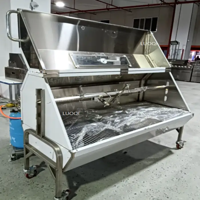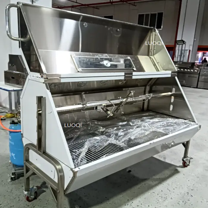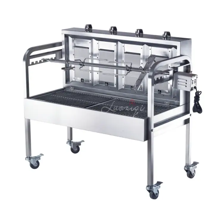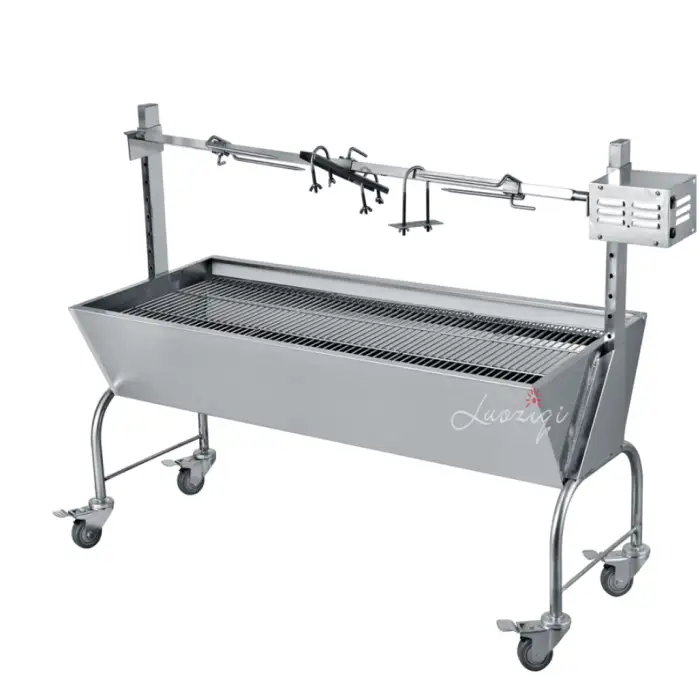 The product supports spit/rotisserie roasting, but inclusion of a spit rod, forks or motor may vary by seller or package. Confirm with the vendor whether those accessories are included or sold separately.