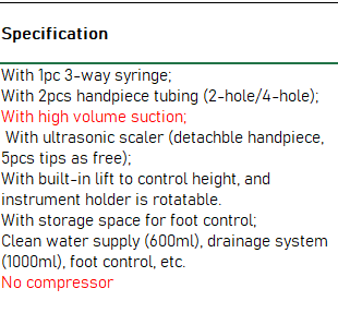 Standard items include 1 three‑way syringe, 2 handpiece tubings (compatible with 2‑hole or 4‑hole handpieces), clean water supply (600 ml), drainage system (1000 ml), and foot control. Depending on the configuration you choose, the unit may also include a high‑volume suction or saliva ejector, LED curing light, and an ultrasonic scaler (detachable handpiece with 5 tips supplied).