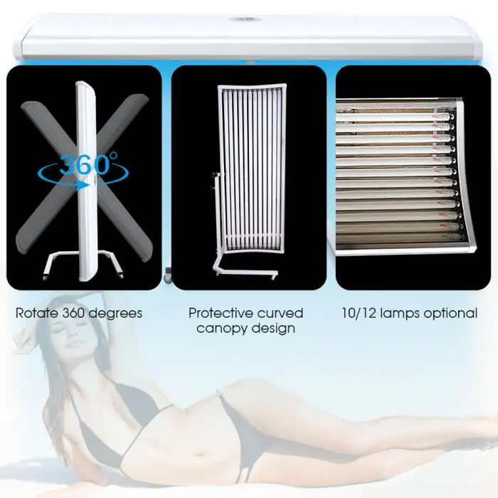 The unit uses the manufacturer-described advanced blue light technology to promote a natural-looking tan. For exact emission spectra and whether UV wavelengths are present, request the technical specifications or certification documents from the seller.
