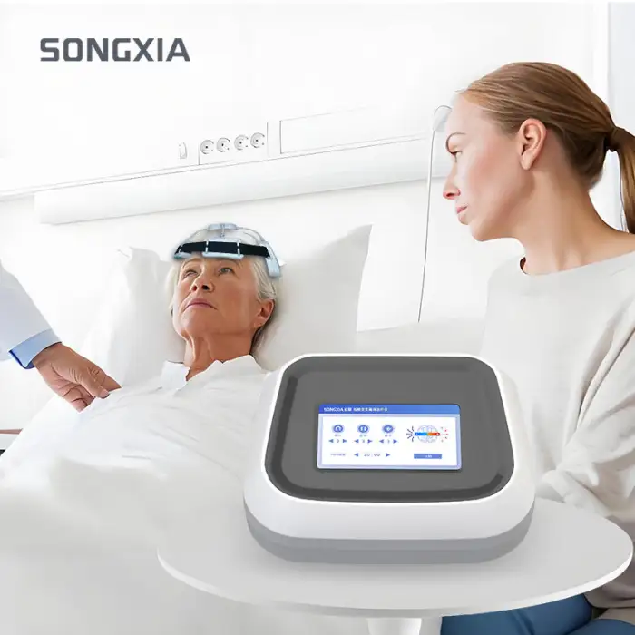 The DE-D1 device is designed for physical therapy and rehabilitation, using transcranial magnetic stimulation (TMS) to assist in recovery from conditions like stroke, depression, anxiety, and chronic pain.