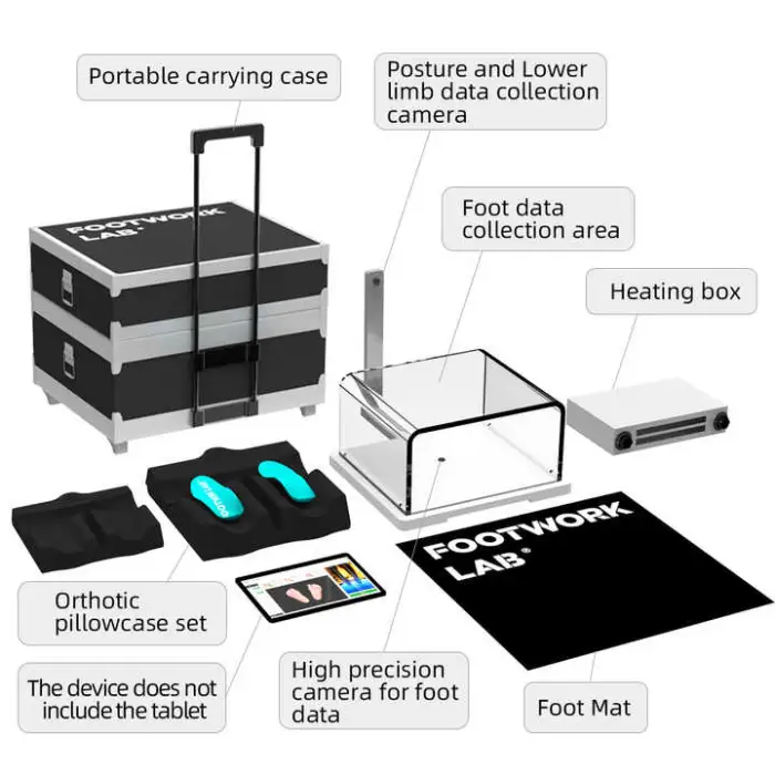 AI provides precise, repeatable analysis, but accuracy depends on correct patient positioning, capture protocol and calibration. For clinical-grade accuracy follow the included setup and scanning procedures; contact FOOTWORK LAB for validation data or accuracy metrics.