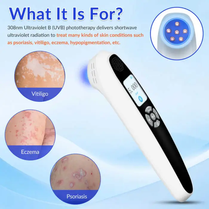 The device uses an ultraviolet light source at a wavelength of 308nm, which is a targeted UVB wavelength commonly used in localized phototherapy treatments.