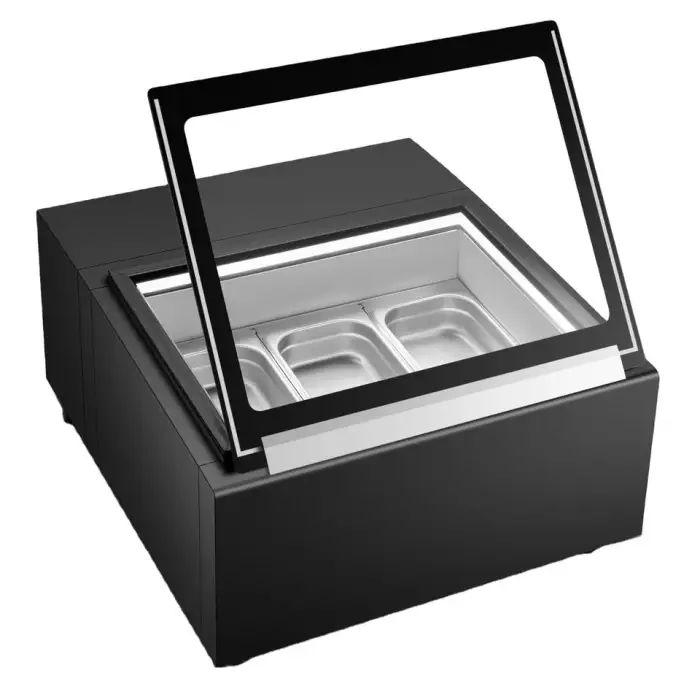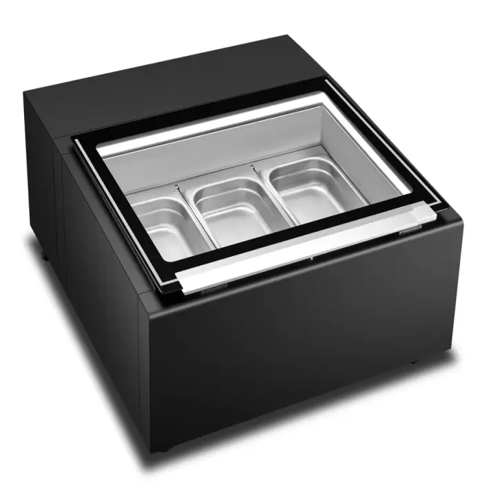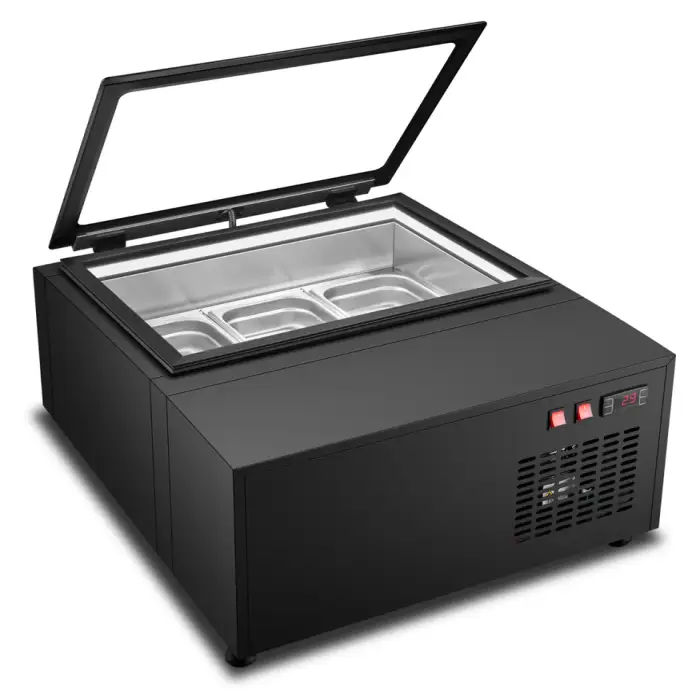 The freezer features three shelves for optimal display of multiple flavors.
