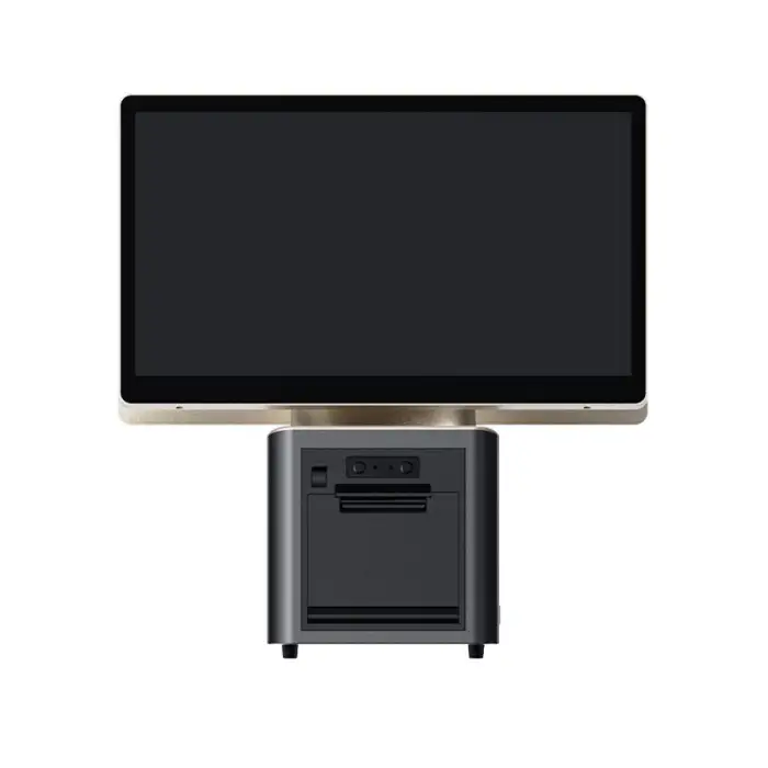 The POS System integrates a computer, printer, and speaker into one compact unit, simplifying the cash register process.