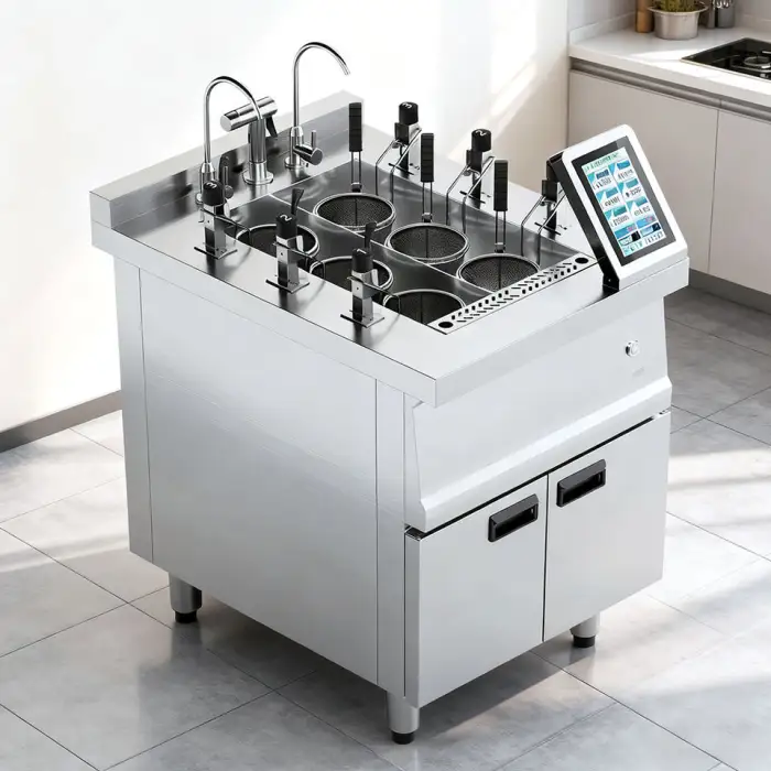 The Professional Gas Noodle Lifting Cooker is made from high-quality 304 stainless steel, which is durable and easy to clean.