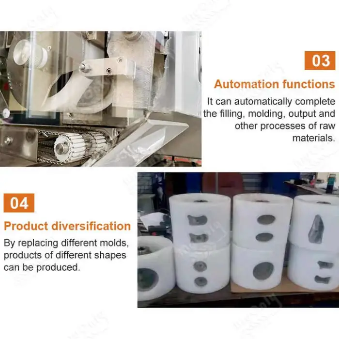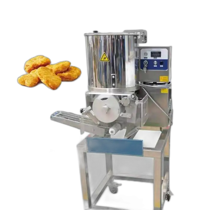 The base machine is designed for standard chicken nuggets and burger patties. For different sizes or shapes, optional molds or tooling may be available—check with the manufacturer or supplier for compatible mold options and customization.