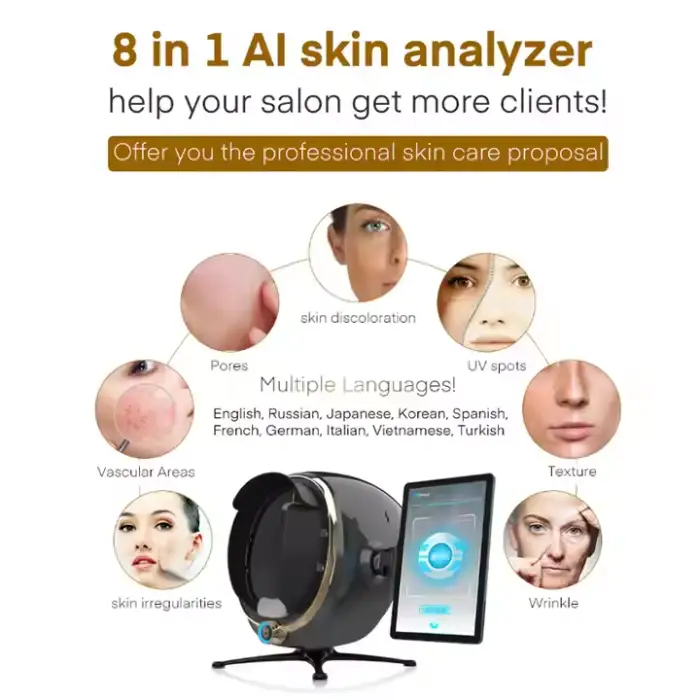 The Promotion Facial Scanner Skin Device is an advanced tool designed for analyzing skin health using patented algorithms and 3D magic mirror technology.