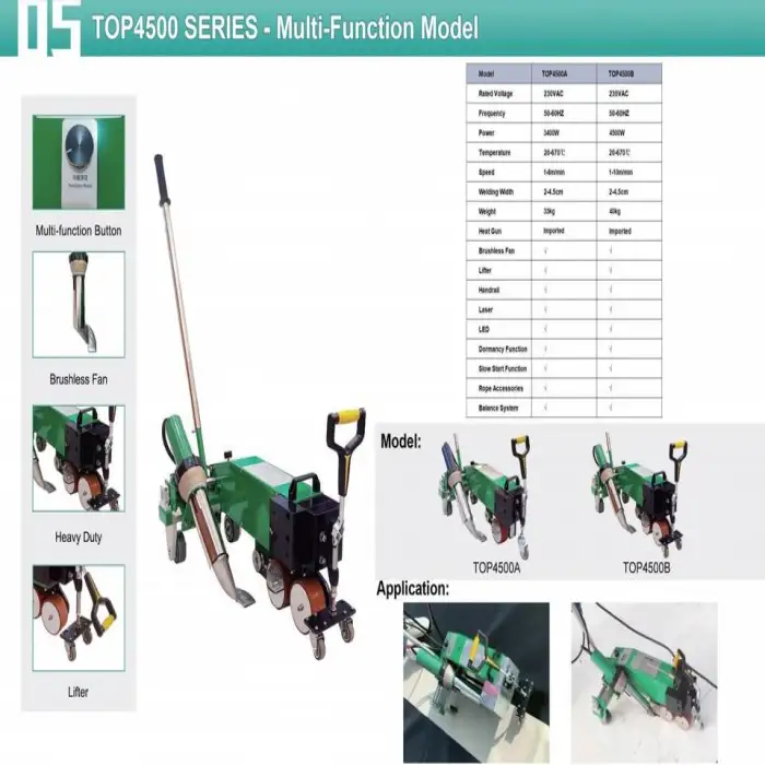 Key features include high-performance welding for PVC membranes, lightweight and portable design, and an efficient welding process.