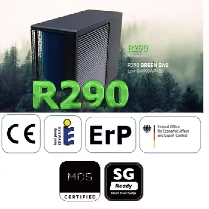 The unit uses R290 as its refrigerant, which is environmentally friendly and efficient.