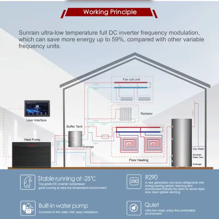 The heat pump operates using an air source, which contributes to 75% of its heating capacity, while electricity accounts for the remaining 25%.