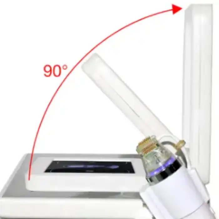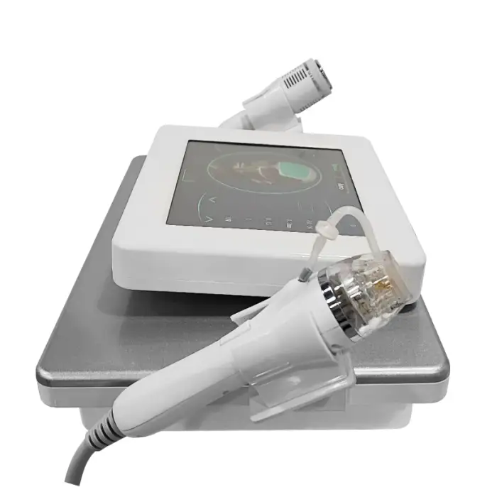 The machine comes with three treatment probes: 10p, 25p, and 64p, each designed for different needle densities and areas of the skin.