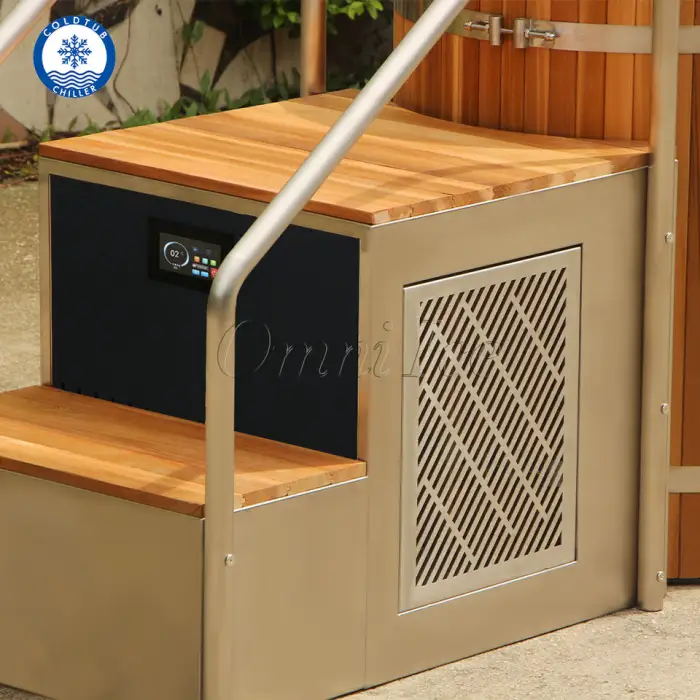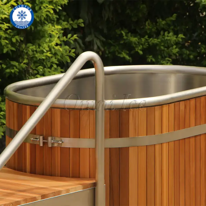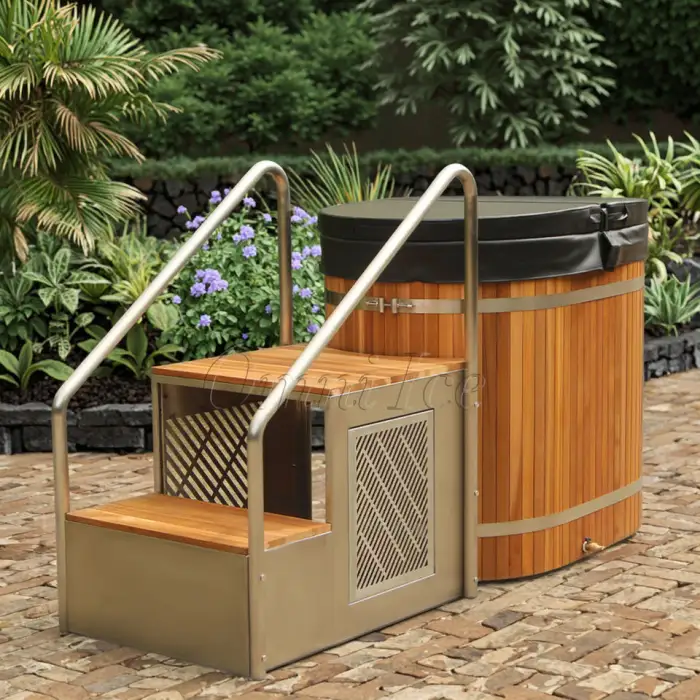 The bathtub is constructed from high-quality stainless steel and red cedar wood, ensuring durability and a stylish appearance.