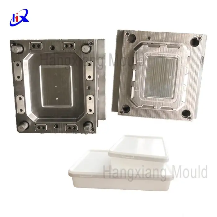 The mould can be used for manufacturing plastic food containers, producing lids, creating packaging solutions for household products, and is suitable for automated production lines.
