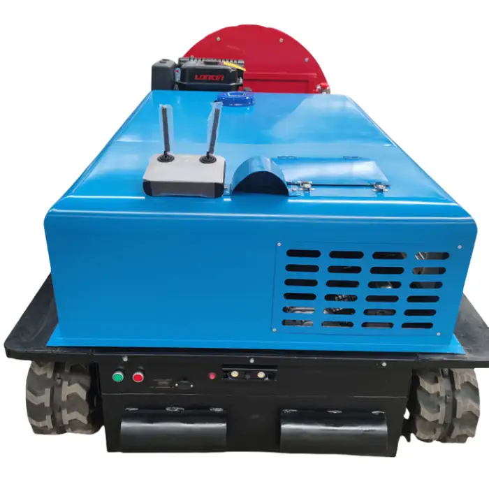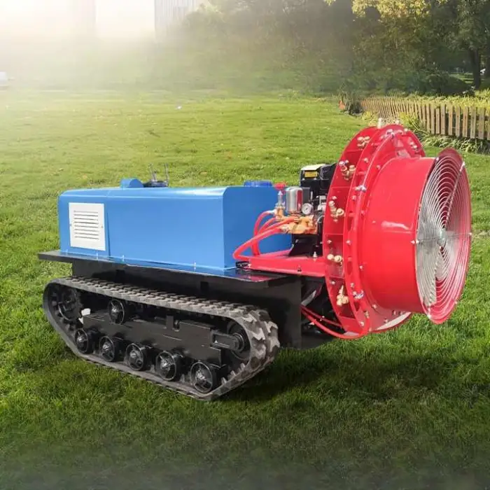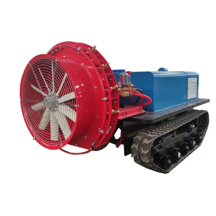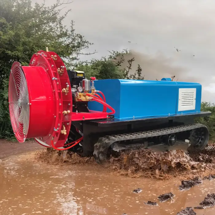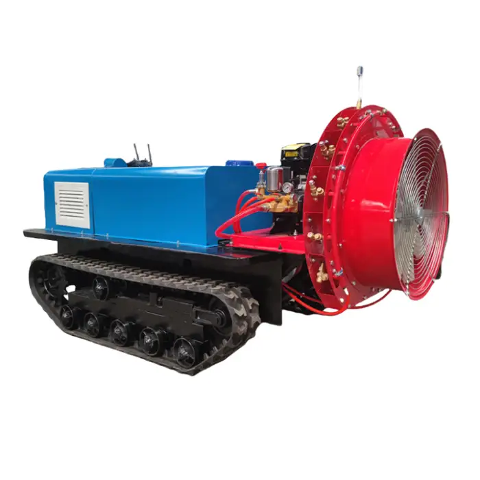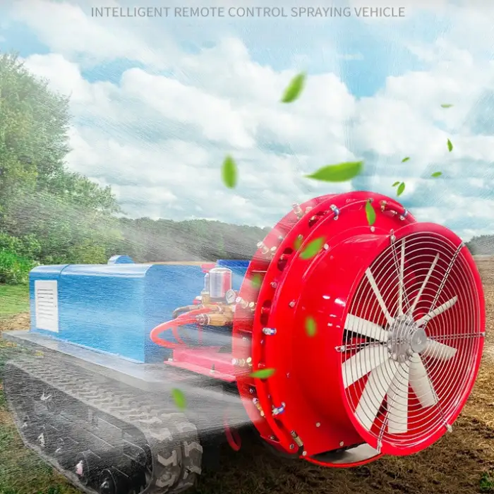 Remote control operation and self-propelled movement let one operator cover larger areas faster than manual spraying. The high-capacity pump reduces refill frequency and the crawler design allows continuous operation across orchard rows, lowering labor costs and saving time.
