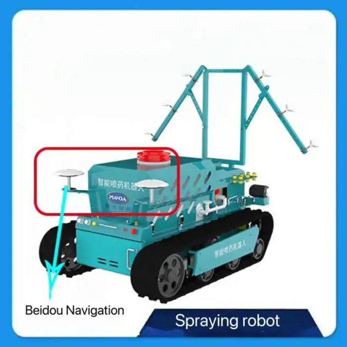 Yes — the robot is designed for orchard spraying. The tracked chassis helps with traction on uneven ground and rows between trees, but confirm clearance, row width compatibility, and fruit canopy access for your specific orchard layout.