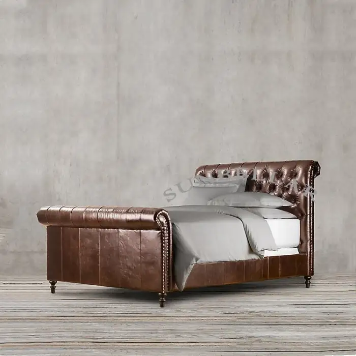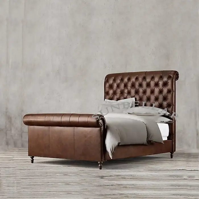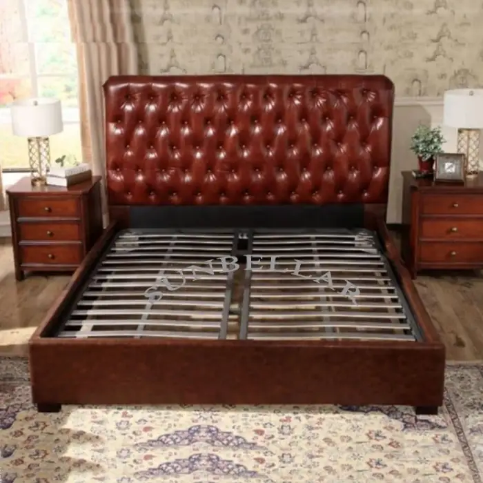 The bed is designed in a mid-century style with a luxurious antique tufted design.
