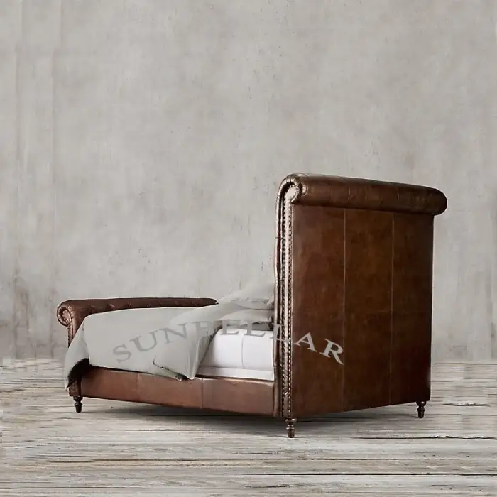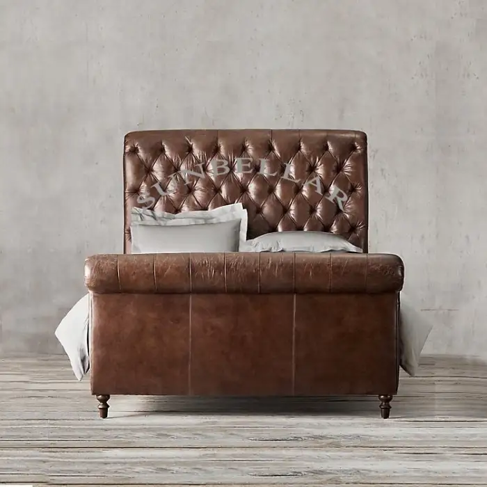 The bed is upholstered in genuine leather, providing a luxurious feel.