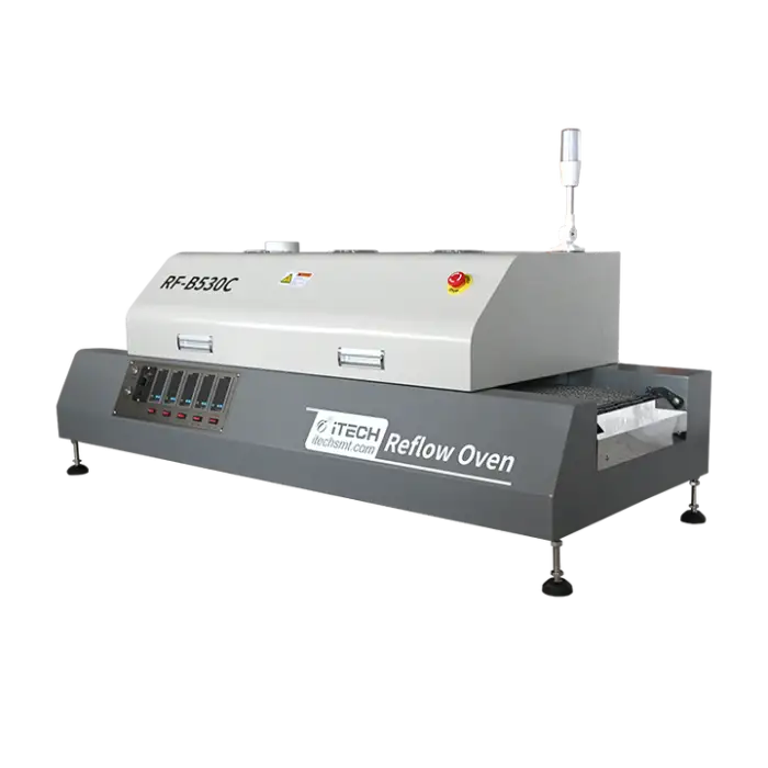 The RF-B530C has five independent heating zones along the oven length. This lets you set different temperatures and ramp rates in each zone (preheat, soak, reflow, etc.) to create precise reflow profiles for consistent soldering and fewer defects.