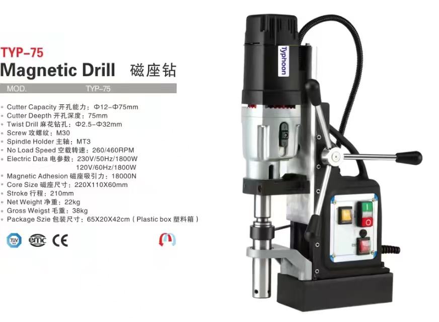 The RJTOOLS TYP-75 Magnetic Drill is designed to cut through steel plate, steel tube, cast iron, and stainless steel.
