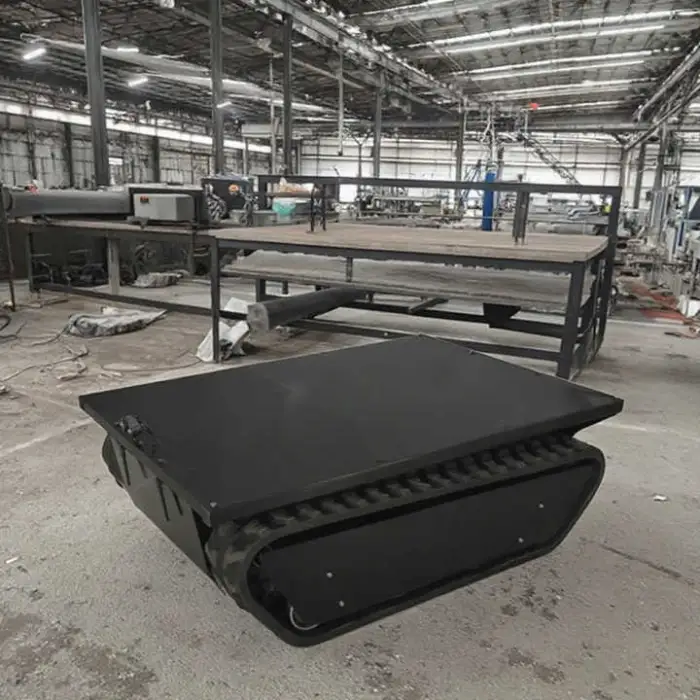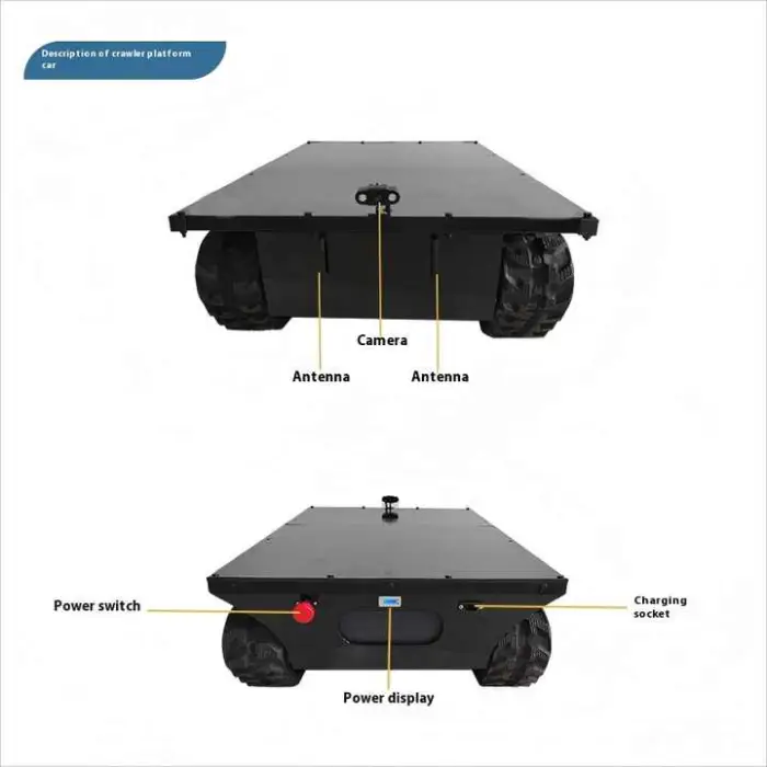 A tracked chassis transport vehicle with durable rubber crawlers and a remote controller. It's designed for easy movement over varied terrain and can be used for play, STEM projects, inspections, prototyping, and hobby activities.
