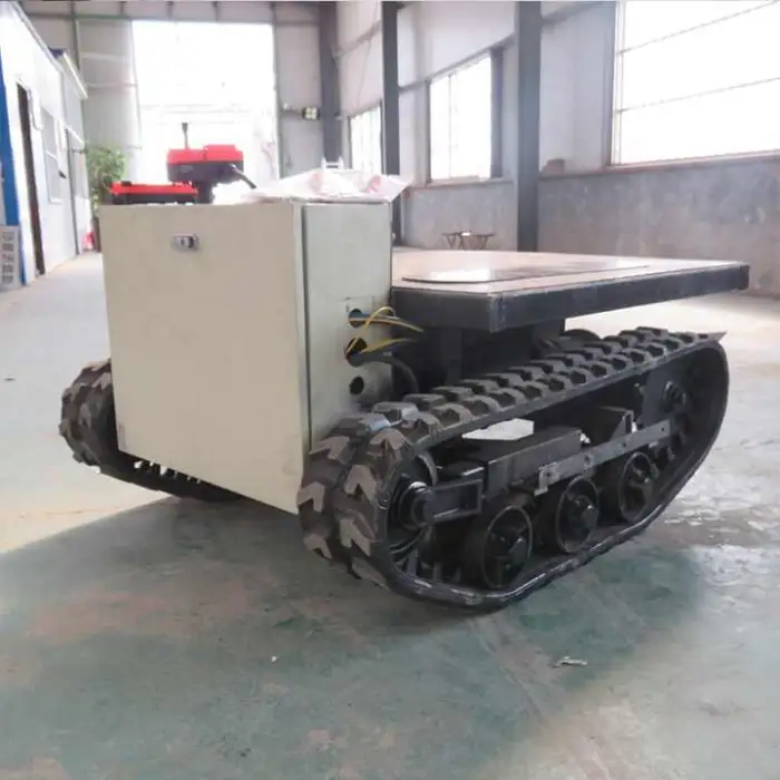 The chassis is constructed from durable steel and rubber, ensuring longevity and performance across different terrains.
