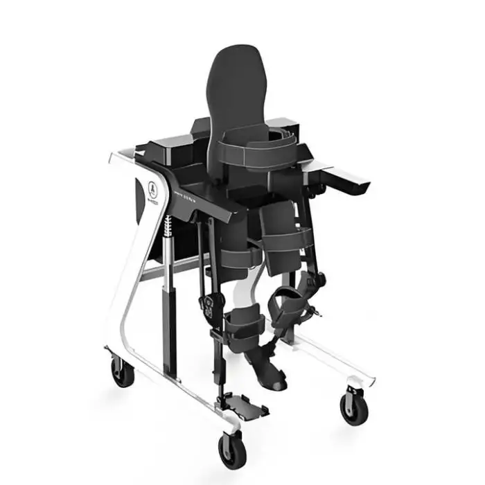 The unit is height-adjustable to accommodate different users. For correct sizing, measure the user's leg and torso dimensions according to the manufacturer’s fitting guide and adjust straps, cuffs and height settings before initiating training. If a fitting guide is not provided, ask the supplier or have a therapist perform the fitting.