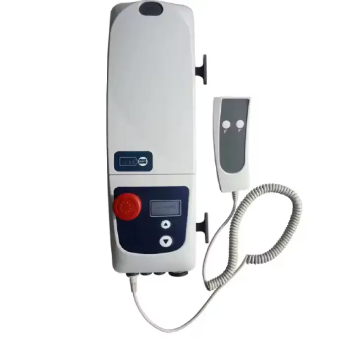 The product description does not specify the drive type. There are both manual and electrically powered patient lifts on the market. Please check the specific model datasheet or contact the supplier for details about power options and controls.
