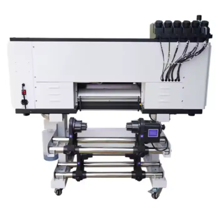 The printer uses UV ink in CMYK+White+Varnish, providing vibrant colors and glossy finishes.