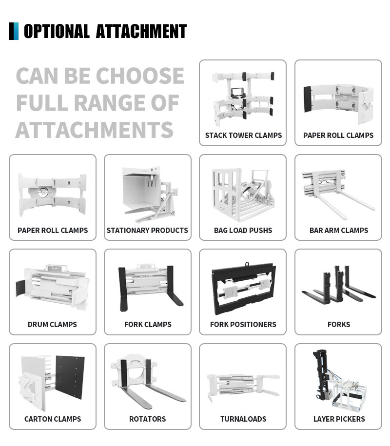 Common attachments include fork extensions, side shifters, paper or carton clamps, rotators and specialized forks. Attachment compatibility depends on mast, carriage and hydraulic options — verify compatibility for your intended attachments.
