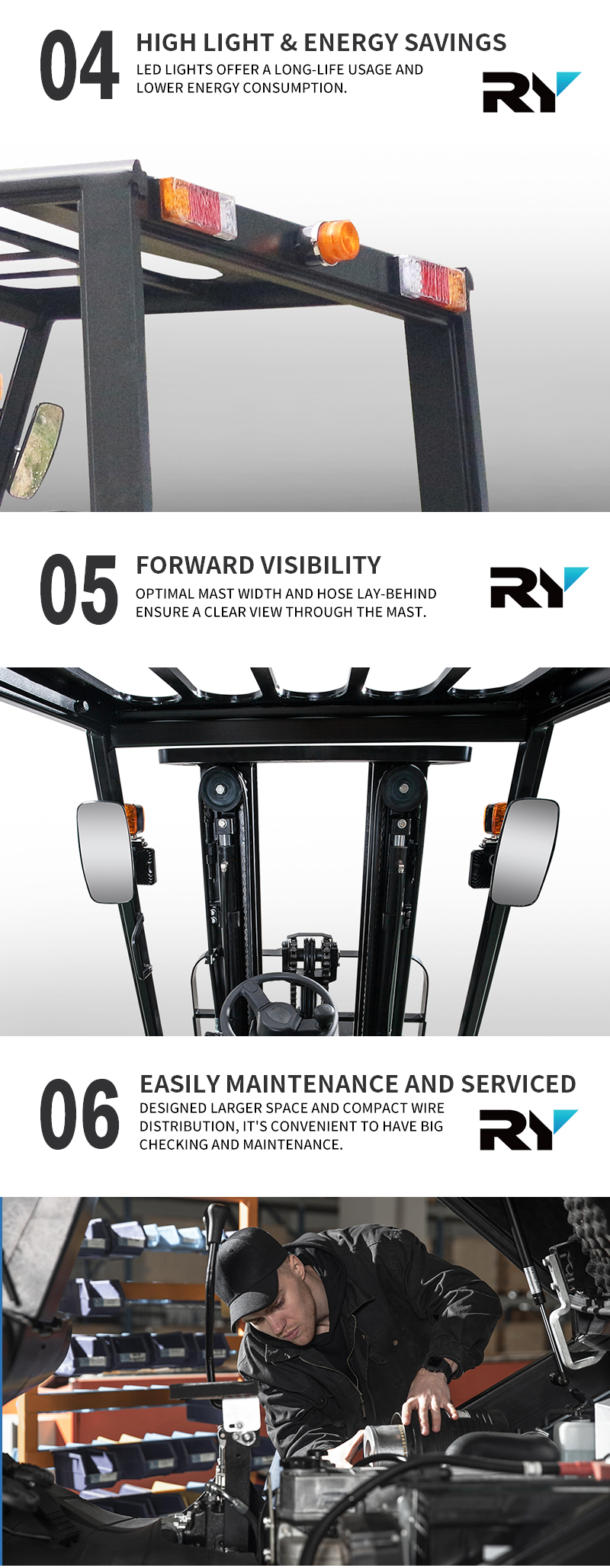 Common safety items for these forklifts include overhead guard, seat belt, horn, lights (head/reverse), mirrors and backup alarm. Additional safety aids such as load backrests, lights or cameras can be added; confirm the factory or dealer fitted safety package.