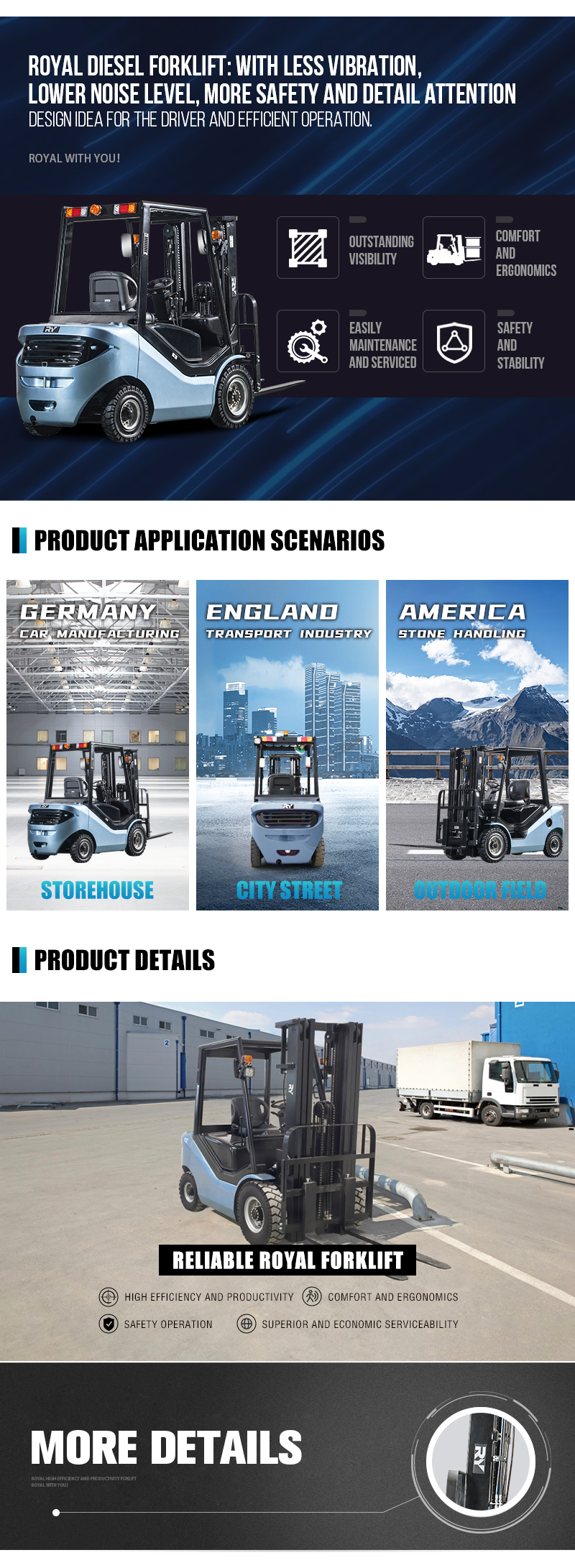 The ROYAL range includes models C15, C18, C20, C25, C30, C35, C40, C45 and C60 corresponding to nominal capacities from 1.5 tonne up to 6.0 tonne. The product listing you provided highlights the 1.5 t, 2.5 t, 3.0 t, 3.5 t and 4.0 t variants — confirm with your dealer which specific models are in stock.