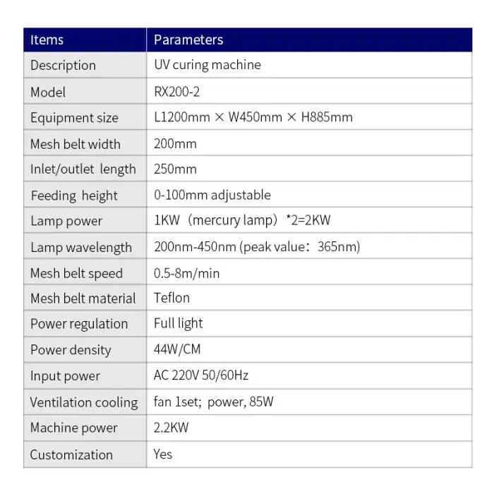 The RX200-2 UV Curing Machine weighs 160 KG.