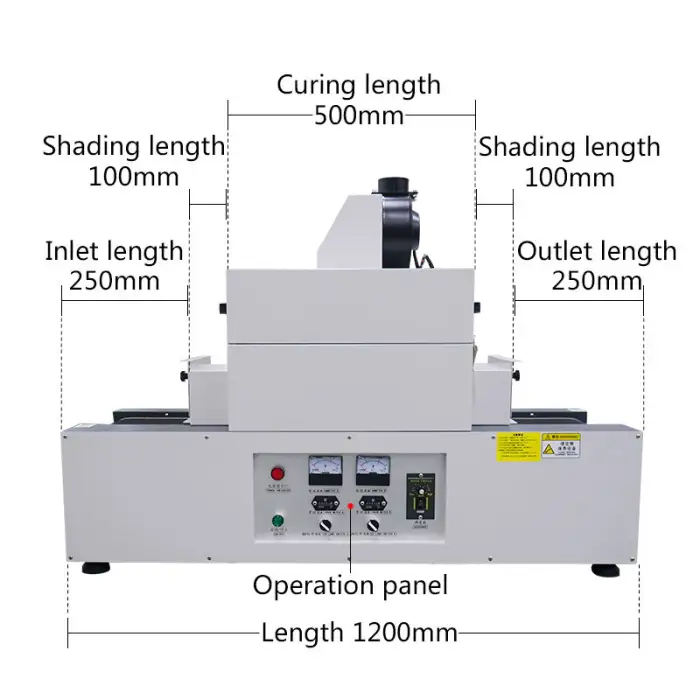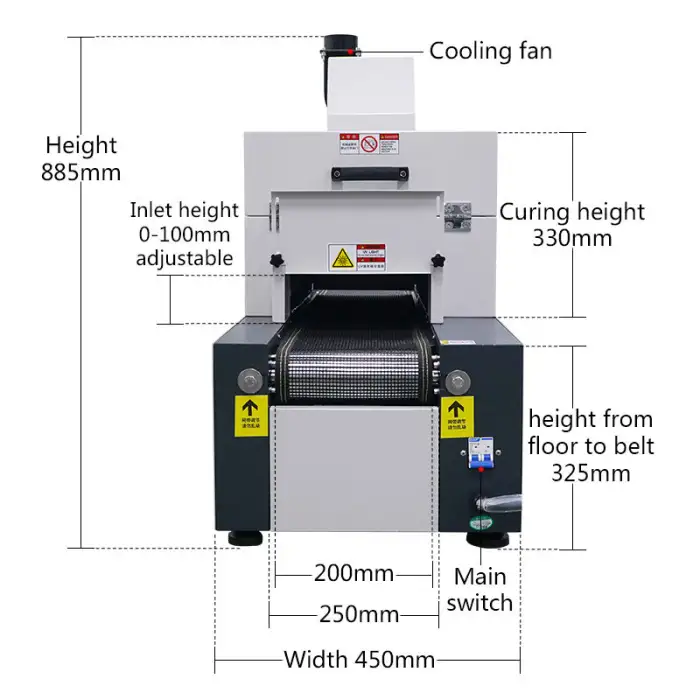 The dimensions of the RX200-2 UV Curing Machine are 1200mm x 450mm x 885mm.
